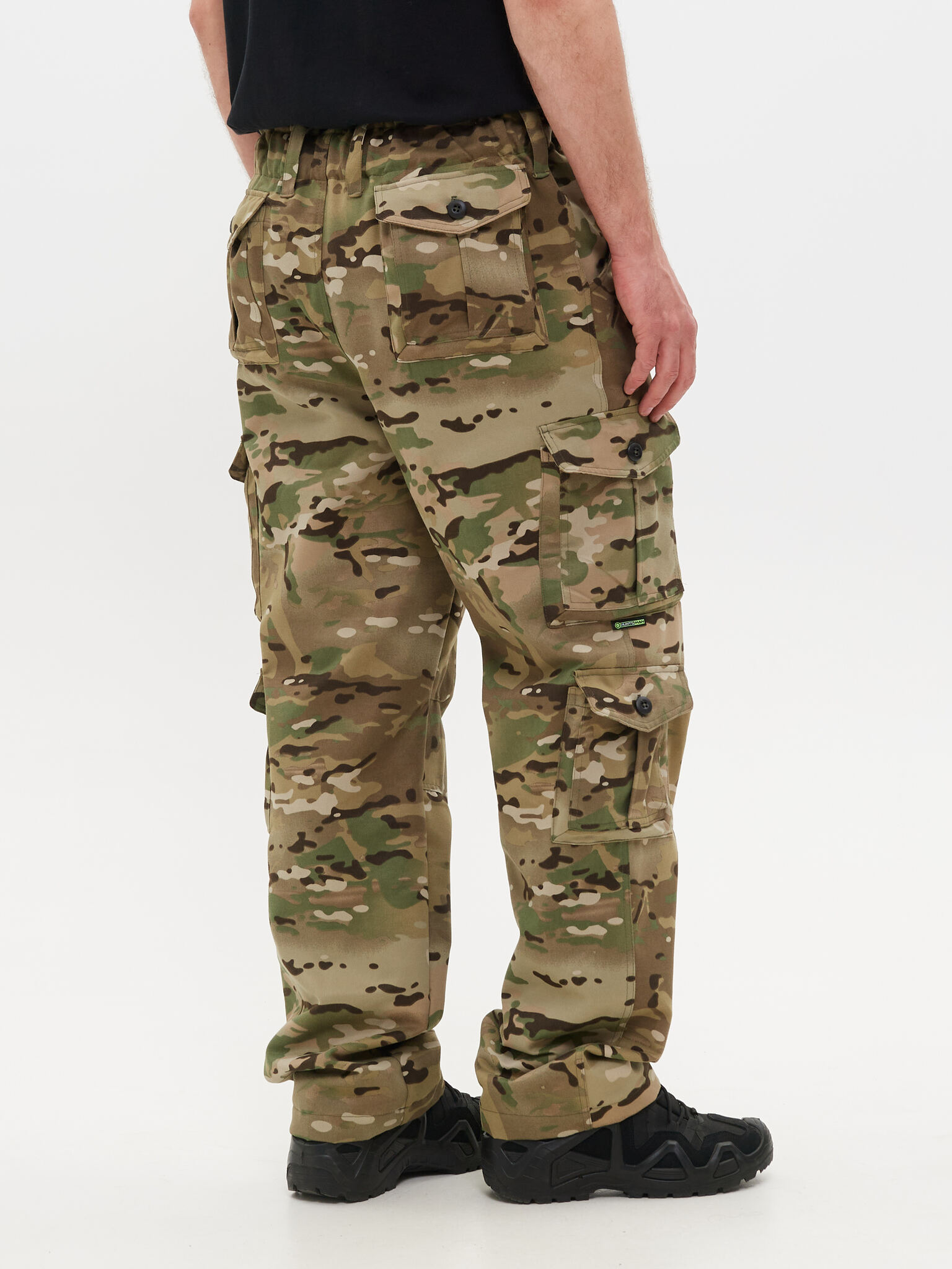 По низу ширина брюк регулируется кулисой. Пояс со шлёвками и резинкой по задней части пояса. На задней половинке брюк расположены накладные карманы с клапаном.