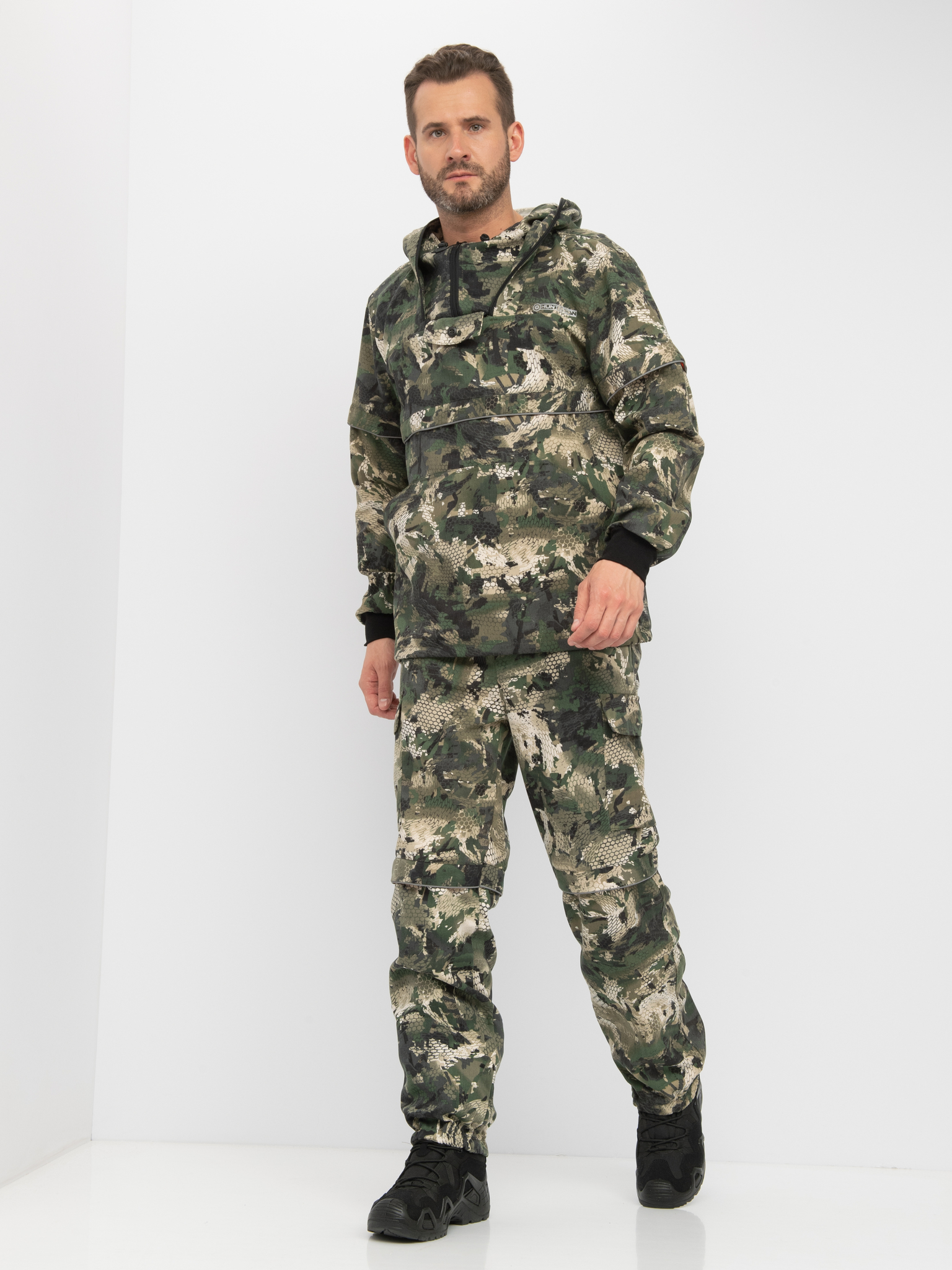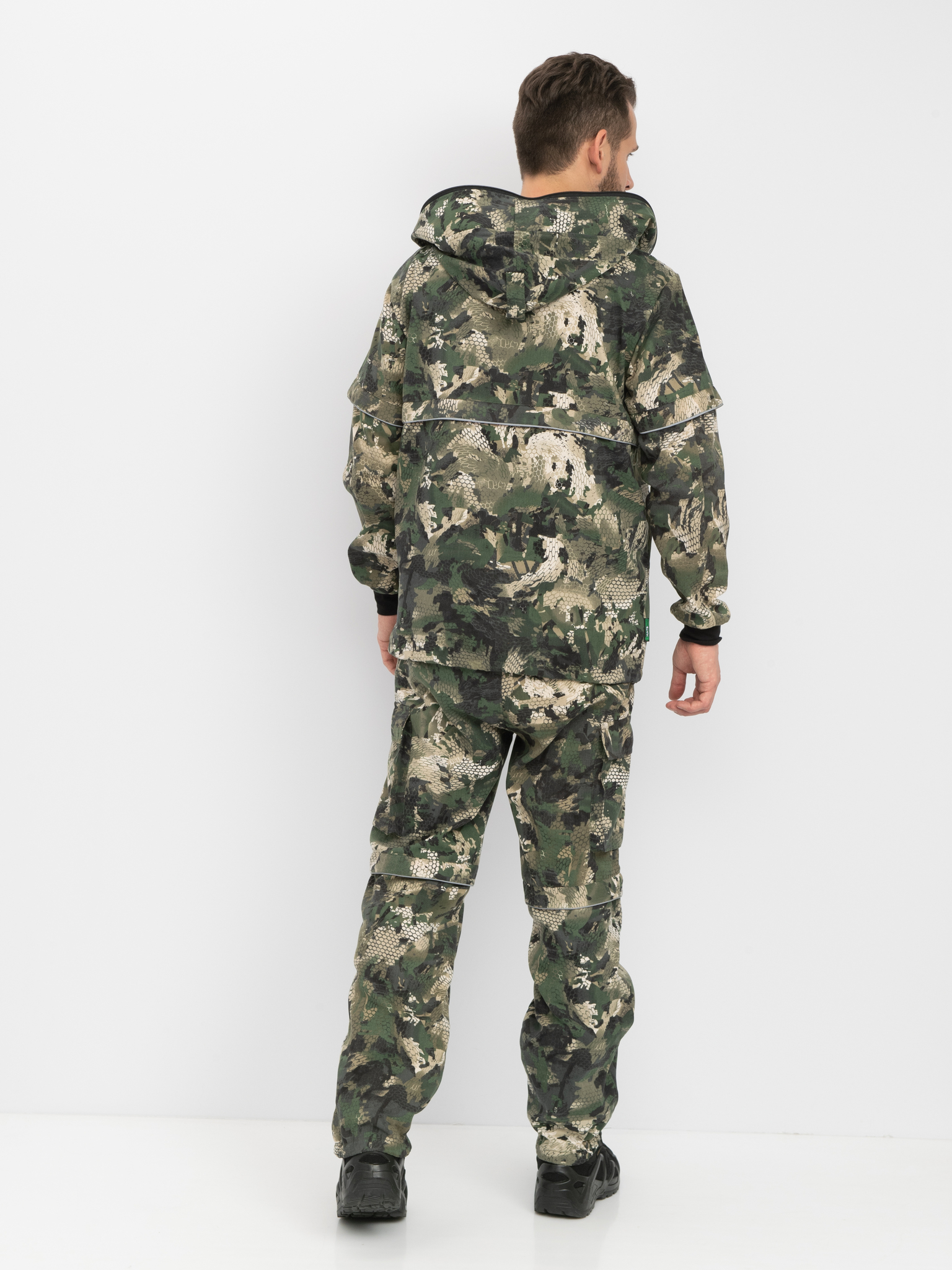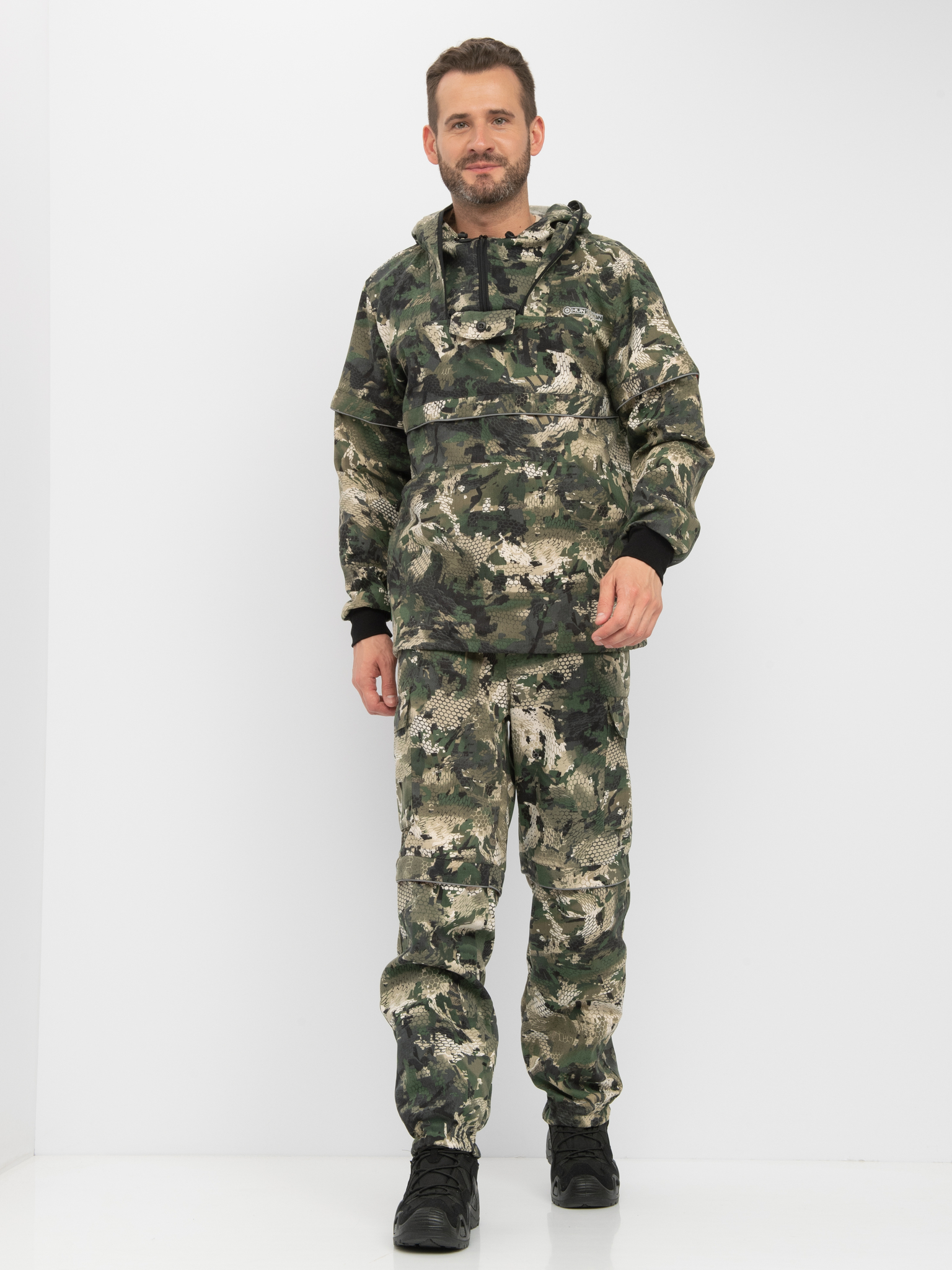 Состоит из куртки и брюк. Куртка с капюшоном и противомоскитной сеткой, убираемой в потайной нагрудный карман. Костюм дополнительно оснащен противоклещевыми ловушками, "юбкой" для исключения доступа к телу для насекомых и пыльников на брюках.